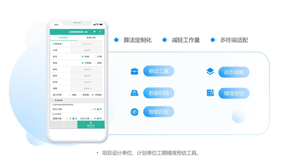 • 算法定制化:根據(jù)行業(yè)標(biāo)準(zhǔn)、工程類型及海拔、氣候等外部因素,多場(chǎng)景定制工期算法;