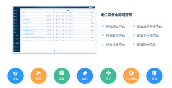 設(shè)備全生命周期管理:從設(shè)備采購(gòu)、設(shè)備安裝調(diào)試、設(shè)備使用、設(shè)備報(bào)廢全過(guò)程進(jìn)行跟蹤,并對(duì)設(shè)備使用期間的維修、拆除、驗(yàn)收、移動(dòng)等所有操作進(jìn)行記錄,實(shí)現(xiàn)設(shè)備全生命周期管理。