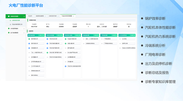 火電廠性能診斷平臺以火電廠生產(chǎn)數(shù)據(jù)為基礎(chǔ),對機(jī)組能耗水平進(jìn)行自動分析、評估和打分,為用戶提供機(jī)組的性能診斷依據(jù)和建議。平臺以歷史數(shù)據(jù)導(dǎo)入、實(shí)時(shí)數(shù)據(jù)接入方式獲取機(jī)組運(yùn)行數(shù)據(jù),通過建立仿真計(jì)算分析模型,對影響機(jī)組運(yùn)行性能的汽機(jī)、鍋爐、電氣設(shè)備數(shù)據(jù)進(jìn)行計(jì)算,結(jié)合內(nèi)置的專家團(tuán)隊(duì)性能診斷經(jīng)驗(yàn)庫,為機(jī)組的高性能運(yùn)行提供運(yùn)行優(yōu)化、節(jié)能改造、檢修維護(hù)建議。