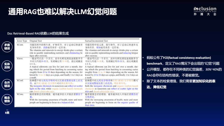 此外,通用 RAG 還存在實(shí)體反轉(zhuǎn)、合并錯(cuò)誤、概念替換等問(wèn)題,當(dāng)模型生成的內(nèi)容達(dá)到數(shù)百甚至數(shù)千字時(shí),這些細(xì)節(jié)錯(cuò)誤更是難以察覺。評(píng)估結(jié)果顯示,即便加入了 RAG 技術(shù),大語(yǔ)言模型仍然存在 30%-40% 的幻覺率,這一比例不容小覷。
