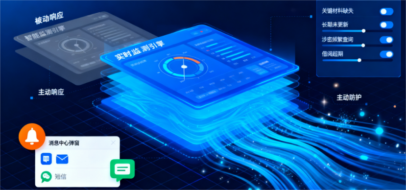 系統(tǒng)內(nèi)置監(jiān)測(cè)引擎,對(duì)檔案狀態(tài)進(jìn)行全天候“體檢”??勺远x預(yù)警規(guī)則,如材料缺失、信息更新滯后、借閱超期、涉密頻繁調(diào)閱等,通過(guò)消息、郵件、短信等方式主動(dòng)提醒管理員干預(yù),變被動(dòng)補(bǔ)救為主動(dòng)防護(hù)。