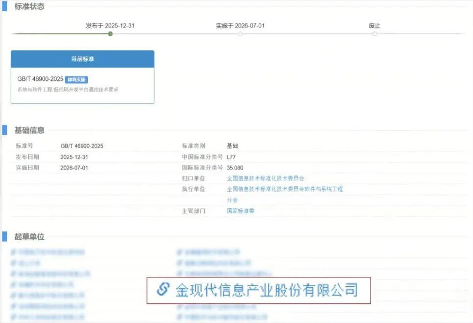 行業(yè)標準的構建離不開頭部企業(yè)的技術沉淀與經(jīng)驗輸出。金現(xiàn)代作為本次國標的參與起草單位,在低代碼領域深耕多年,技術實力行業(yè)領先。公司已相繼參編國內(nèi)首個低代碼開發(fā)平臺標準、首個低代碼大模型標準等核心標準,是國內(nèi)首批通過信通院測評的18家低代碼廠商之一,是IDC認可的“AI+低代碼中國市場代表廠商”之一。此次參與國標制定,既是對公司技術積累的認可,也是金現(xiàn)代踐行行業(yè)責任、推動產(chǎn)業(yè)規(guī)范發(fā)展的體現(xiàn)。